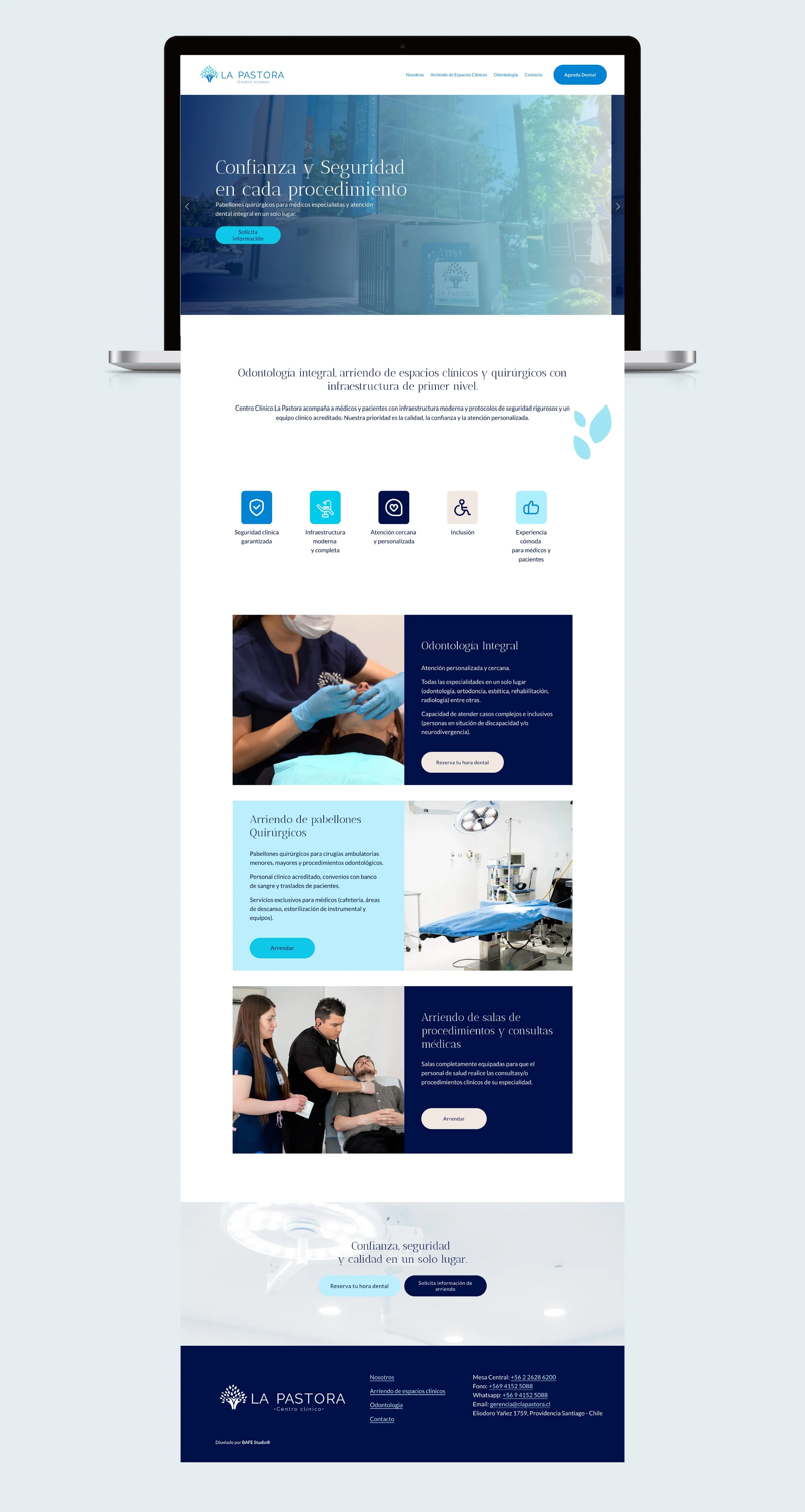 Sitio web desarrollado para Centro Clínico La Pastora, institución enfocada en atención odontológica integral y arriendo de espacios clínicos y quirúrgicos. El proyecto fue pensado para construir una experiencia digital clara, profesional y confiable, capaz de presentar sus servicios, infraestructura y propuesta de valor de forma ordenada y fácil de recorrer.